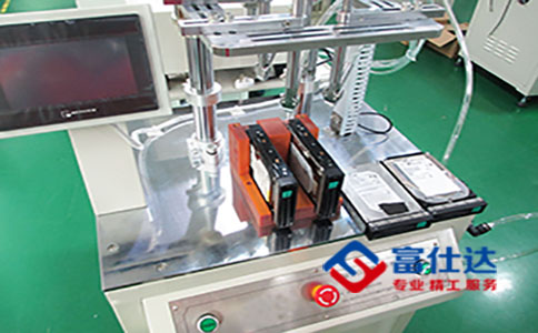 產品為機械硬盤,需要鎖付兩面,每面各需要緊固2顆螺絲,如圖我們可以看到,設備上設有2個治具,可以放置2個產品,也就是說一次可鎖付2*4=8顆螺絲,設備采用的是電批,電批的優(yōu)點是方便,舒適,扭力穩(wěn)定度高且價格實惠!客戶使用這臺設備只需一名作業(yè)員放置產品就可輕松完成鎖付工序,快速提高工作效率,節(jié)省工人成本。